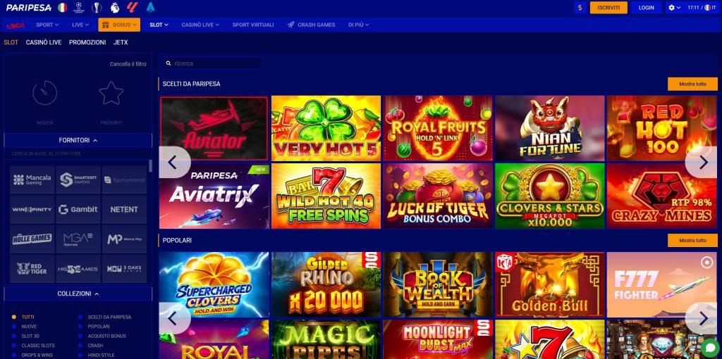 Oltre alla sua ampia sezione dedicata alle scommesse, Paripesa dispone di un Casino di alto livello, ideale per gli amanti dei giochi d’azzardo. Troverai numerose varianti di Roulette, così come giochi come il Poker, Blackjack, Baccarat, le famose slot machine, senza dimenticare il Bingo e i mini-giochi (inclusi titoli popolari come Aviator).